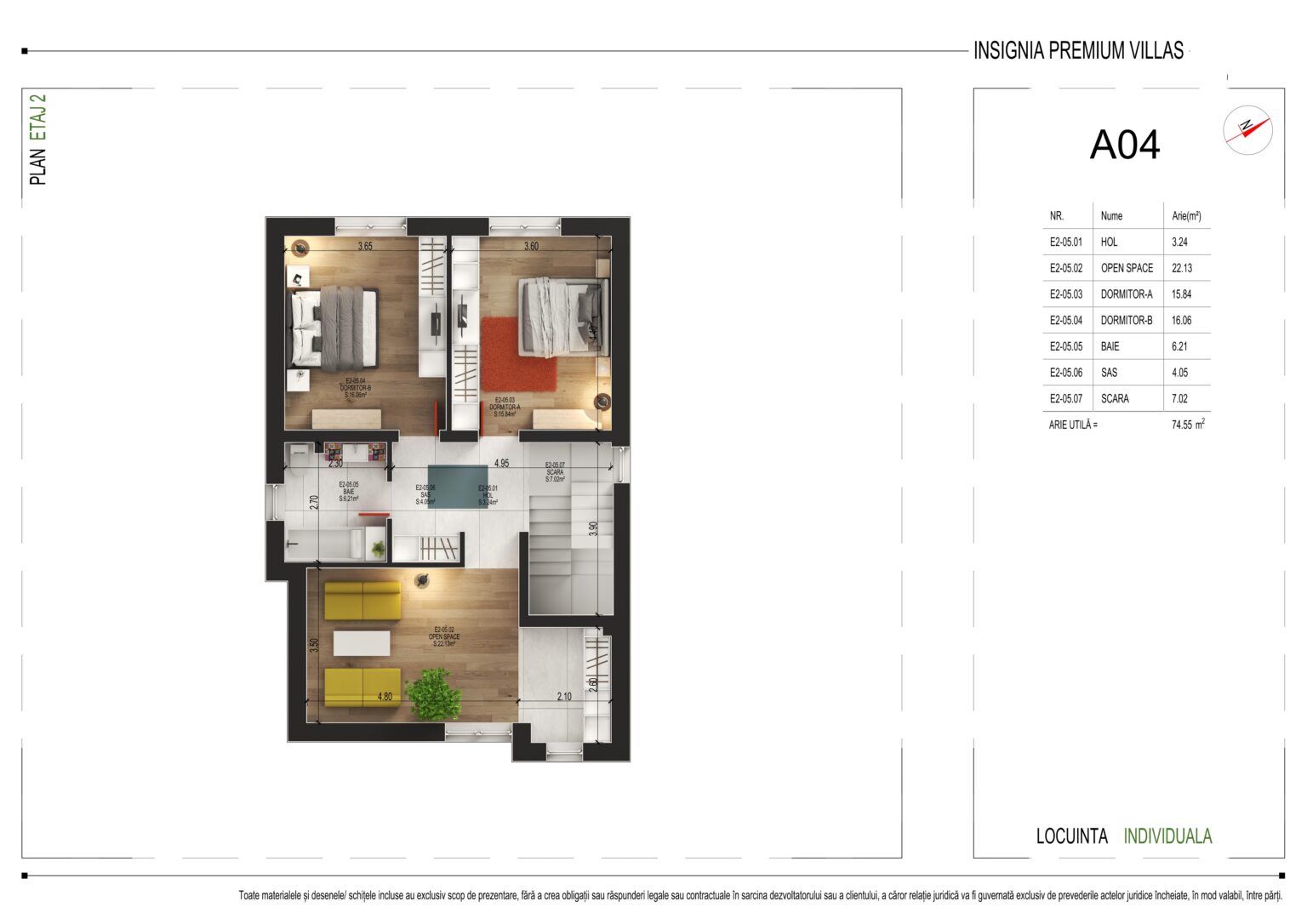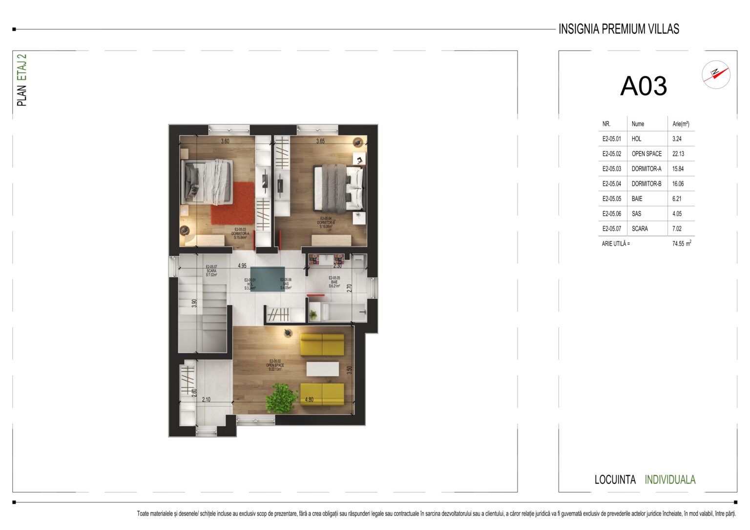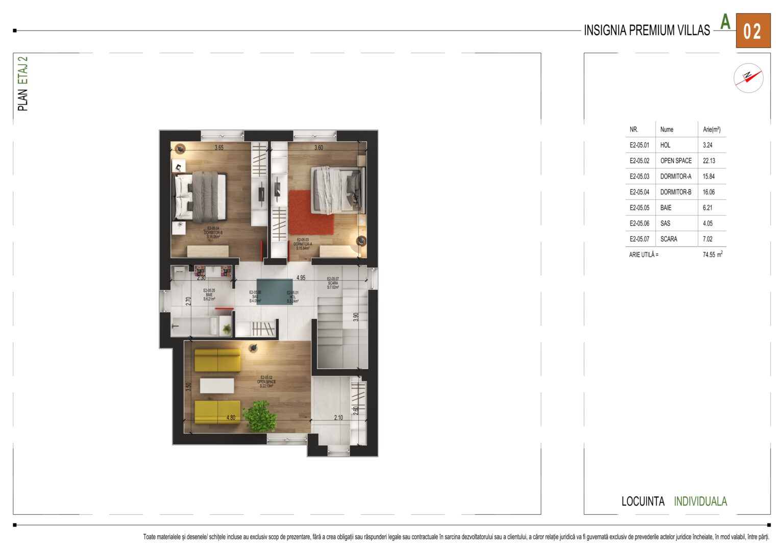 Cu o arie utilă totală de 74,55 m², etajul 2 oferă următoarea compartimentare: