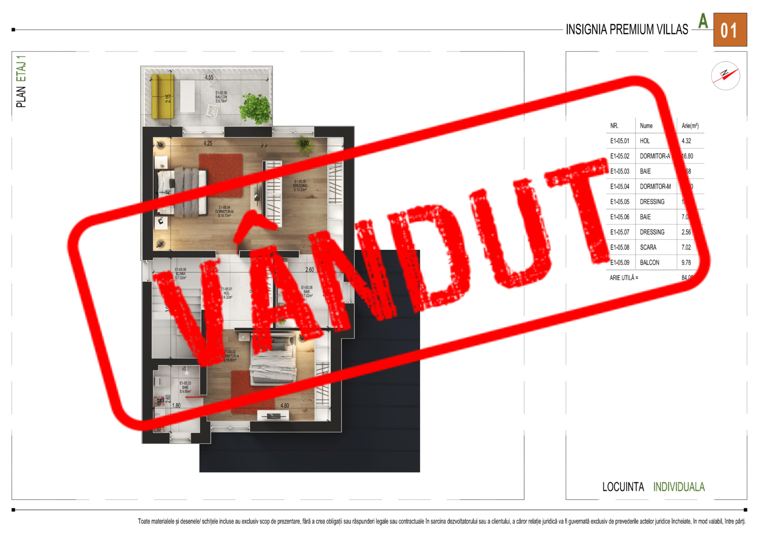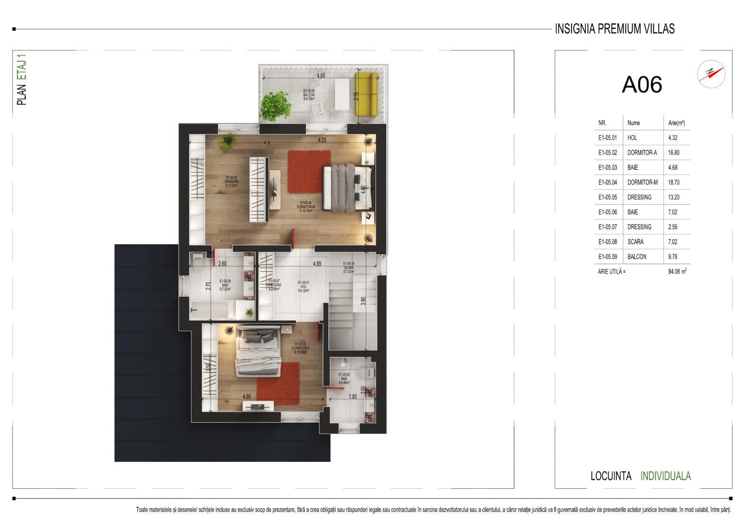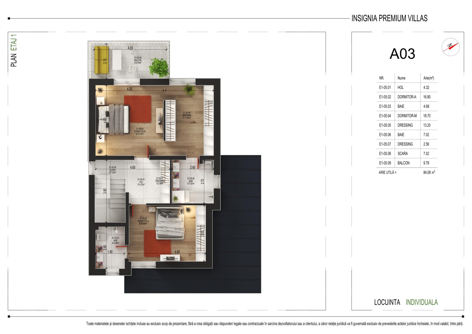 Cu o arie utilă totală de 84,08 m², etajul 1 oferă următoarea compartimentare: