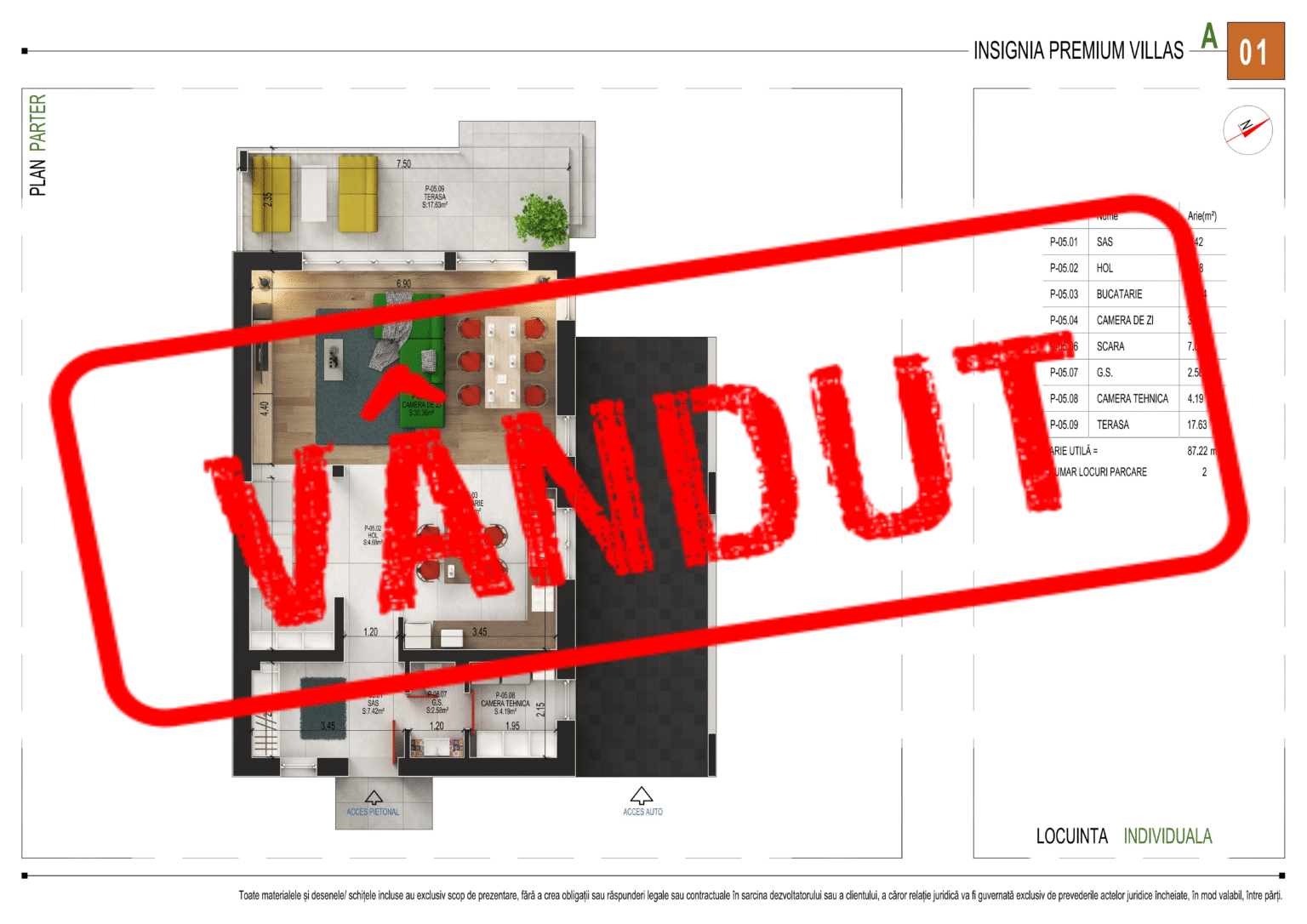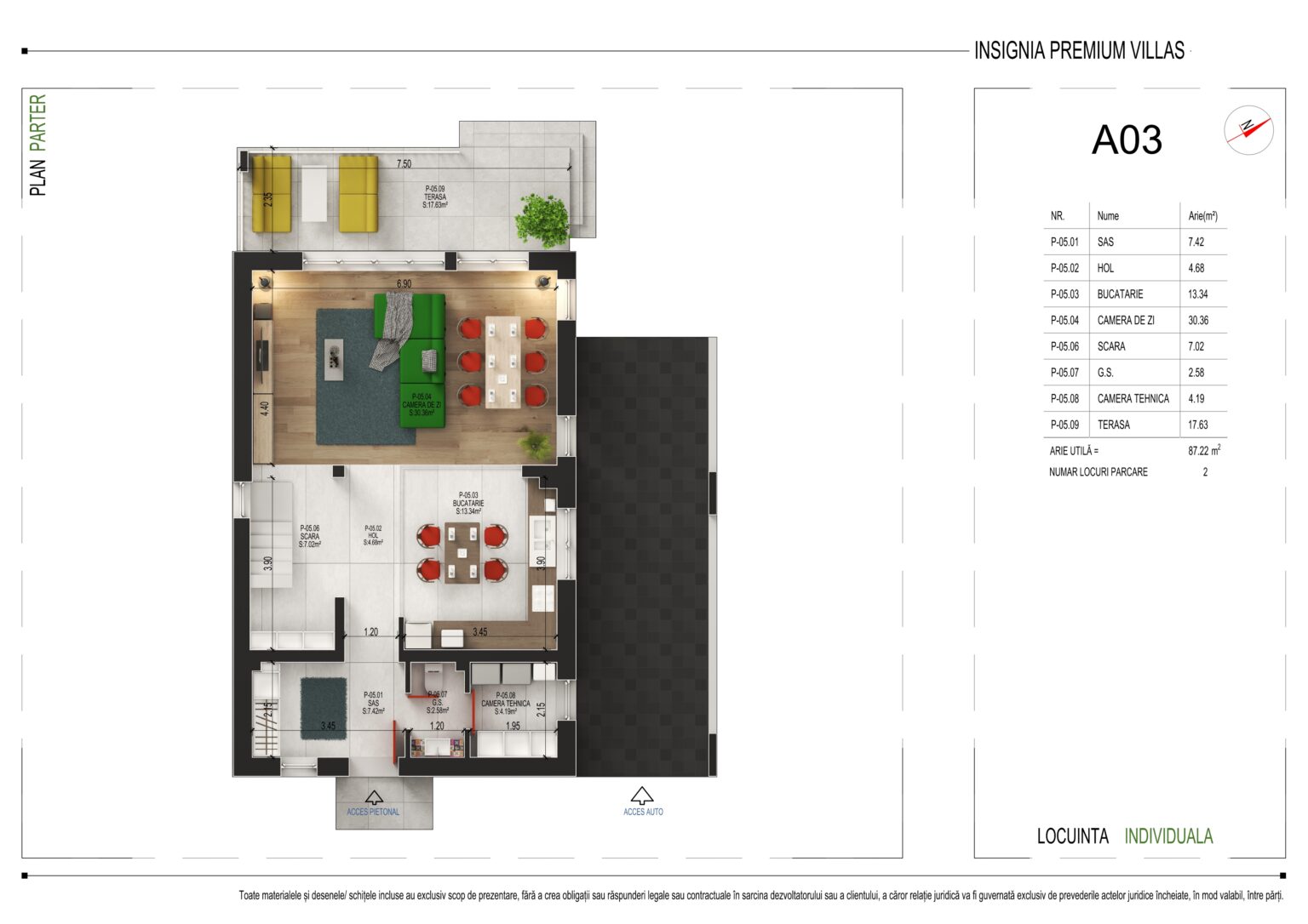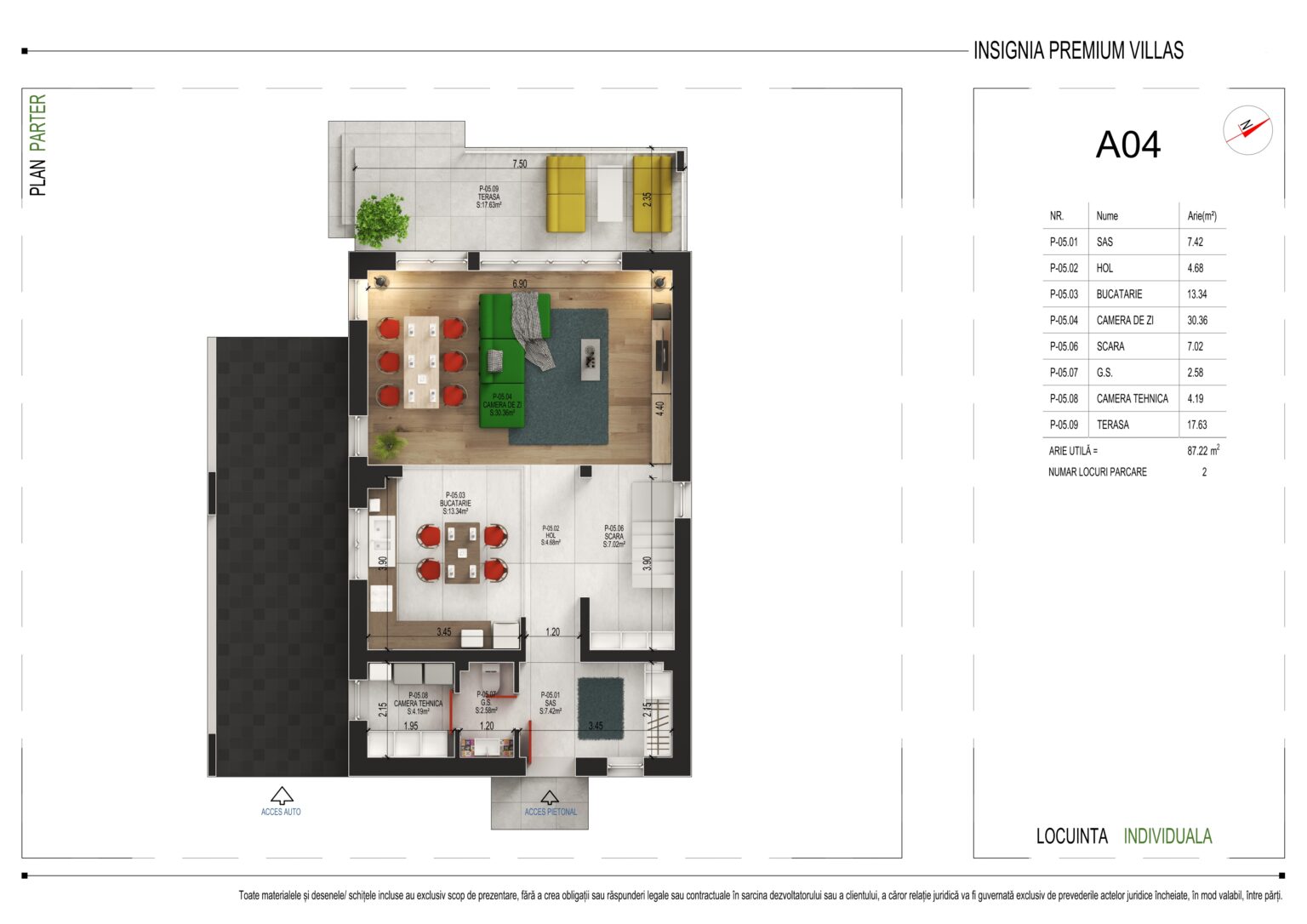 Cu o arie utilă totală de 87,22 m², parterul oferă următoarea compartimentare: