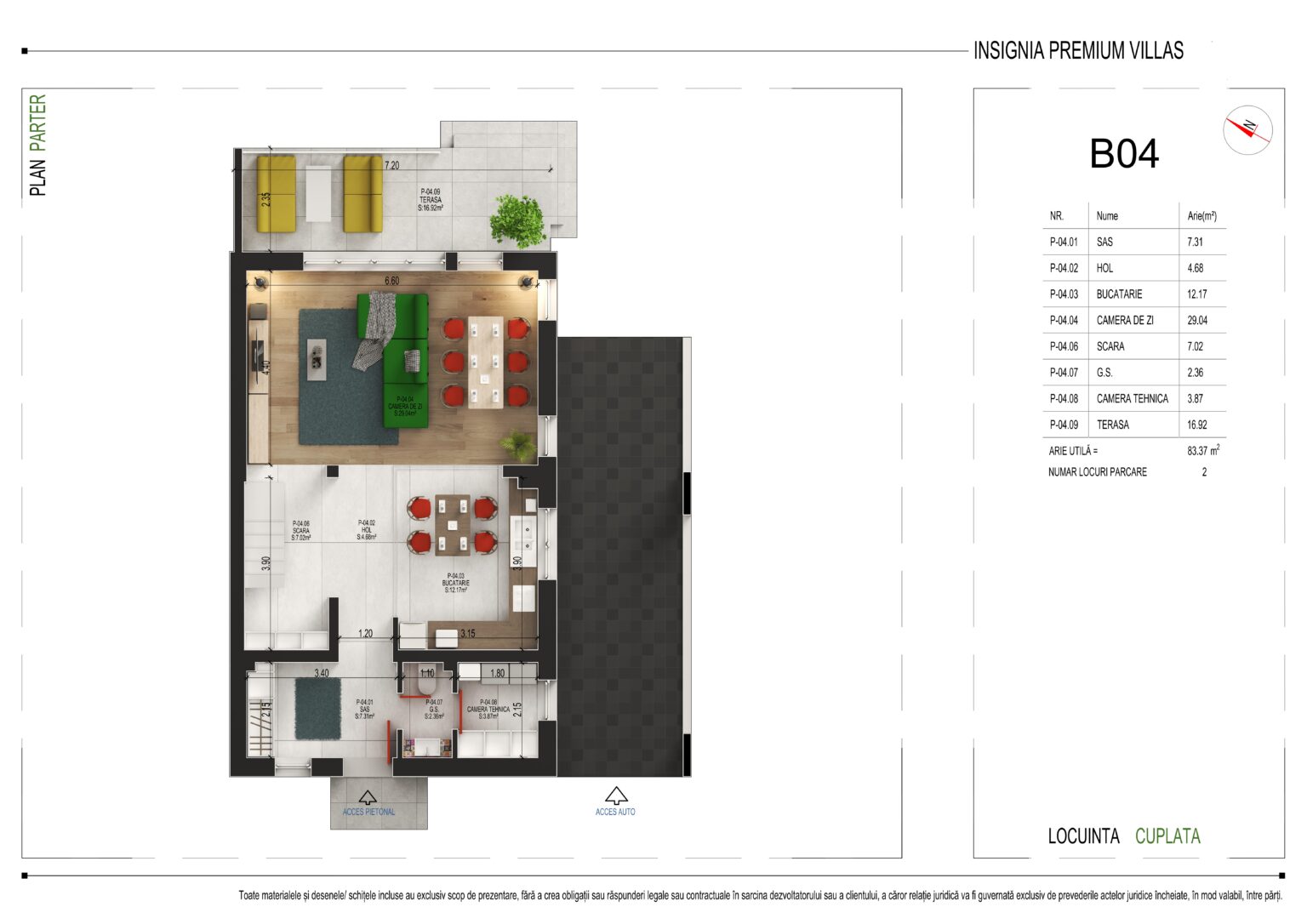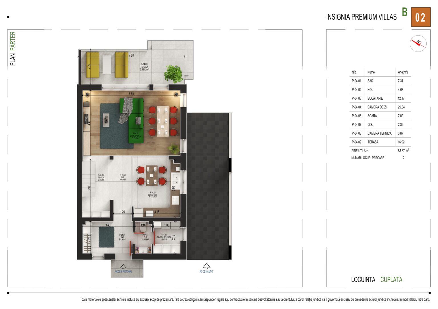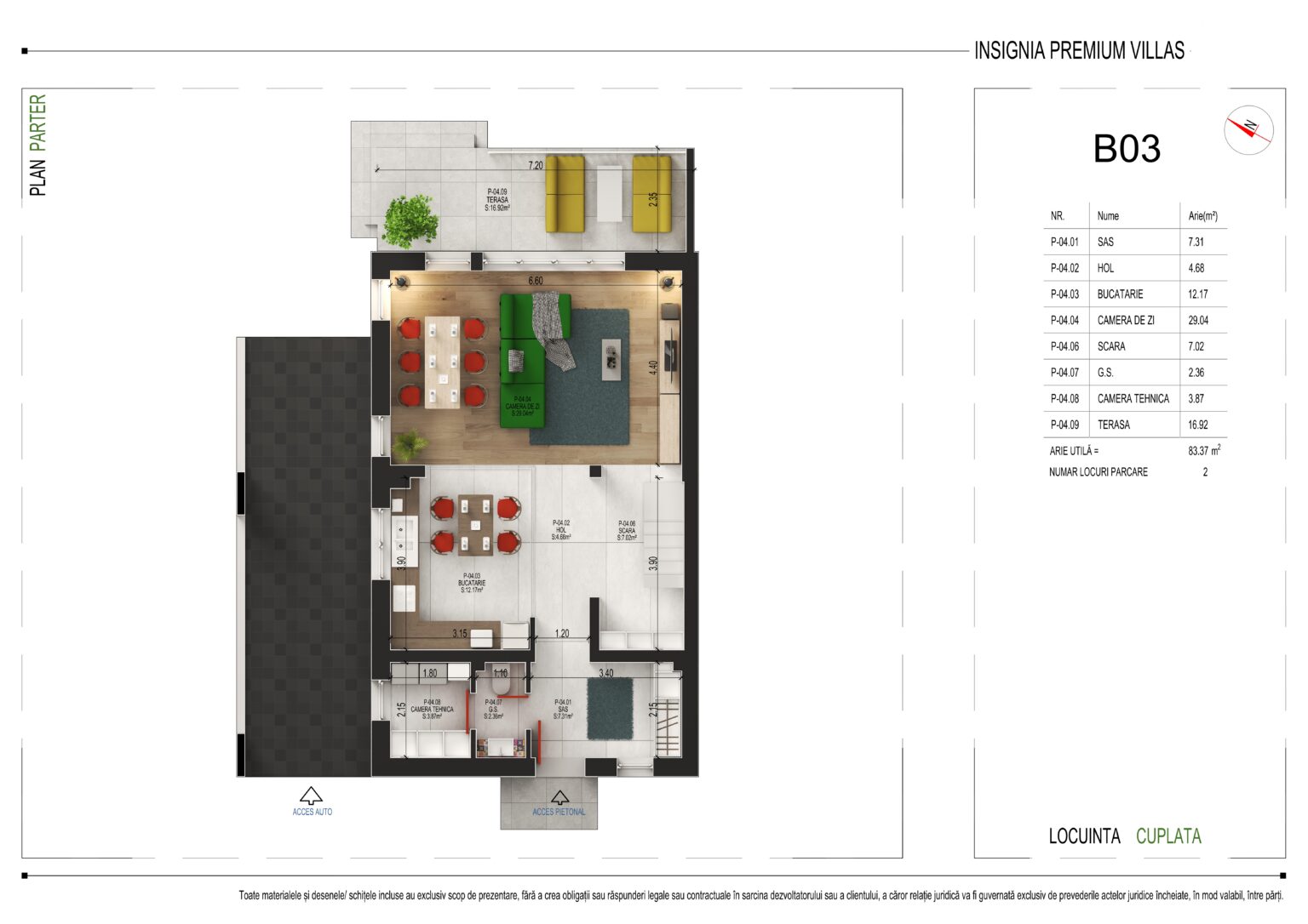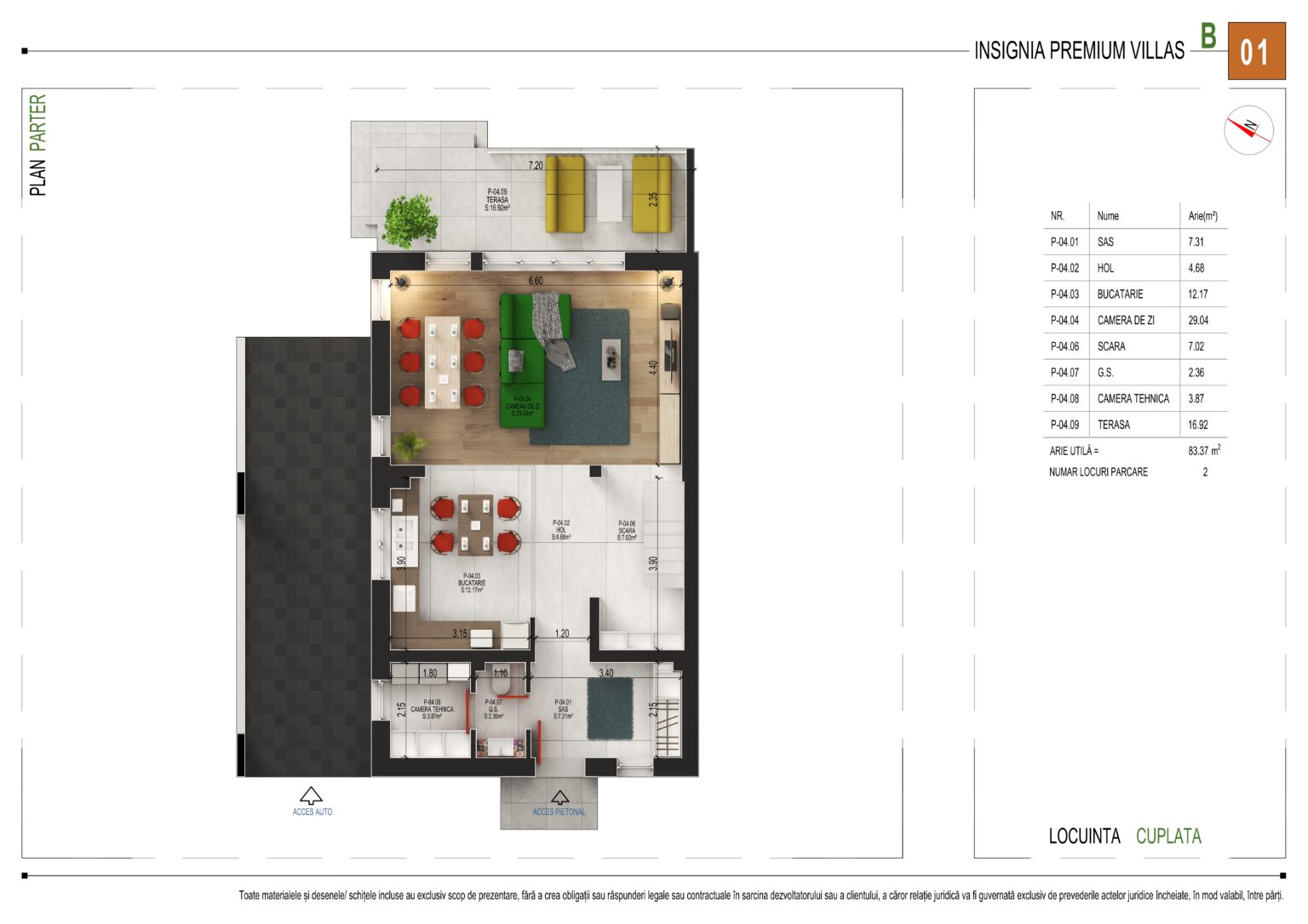 Cu o arie utilă totală de 83,37 m², parterul oferă următoarea compartimentare: