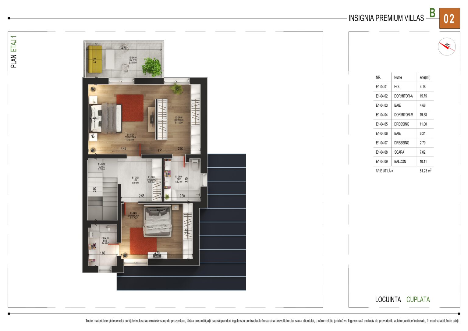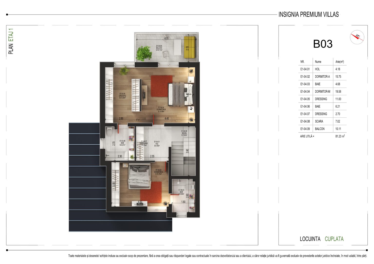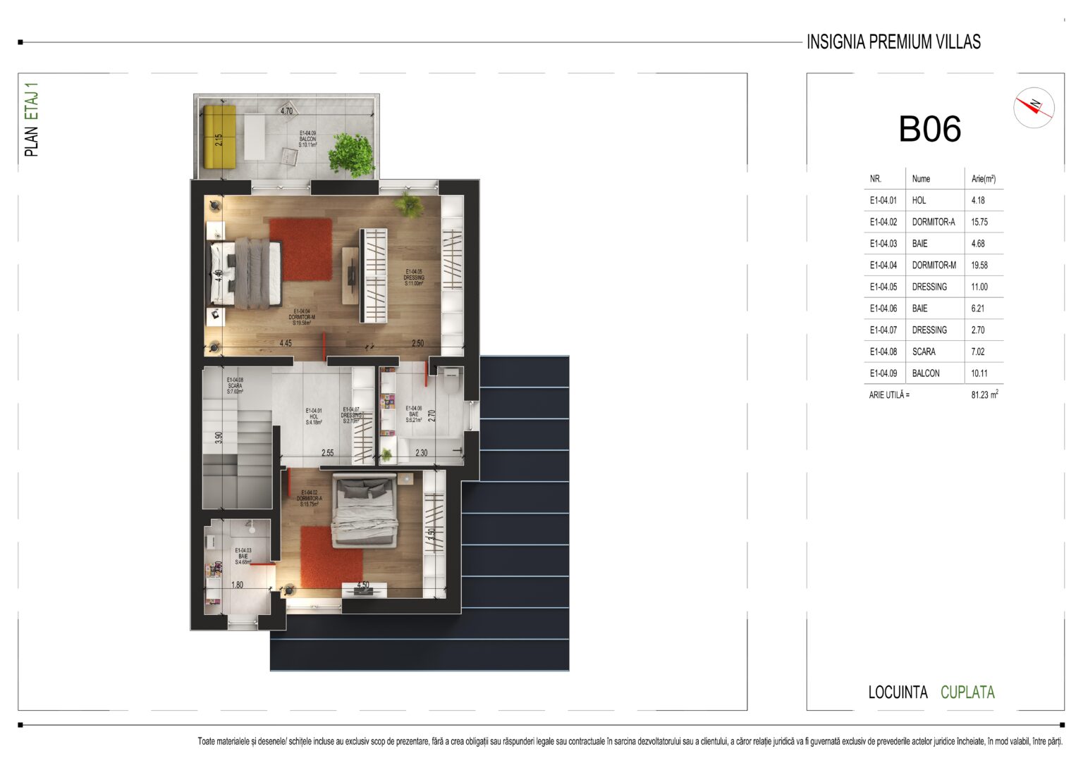 Cu o arie utilă totală de 81,23 m², etajul 1 oferă următoarea compartimentare: