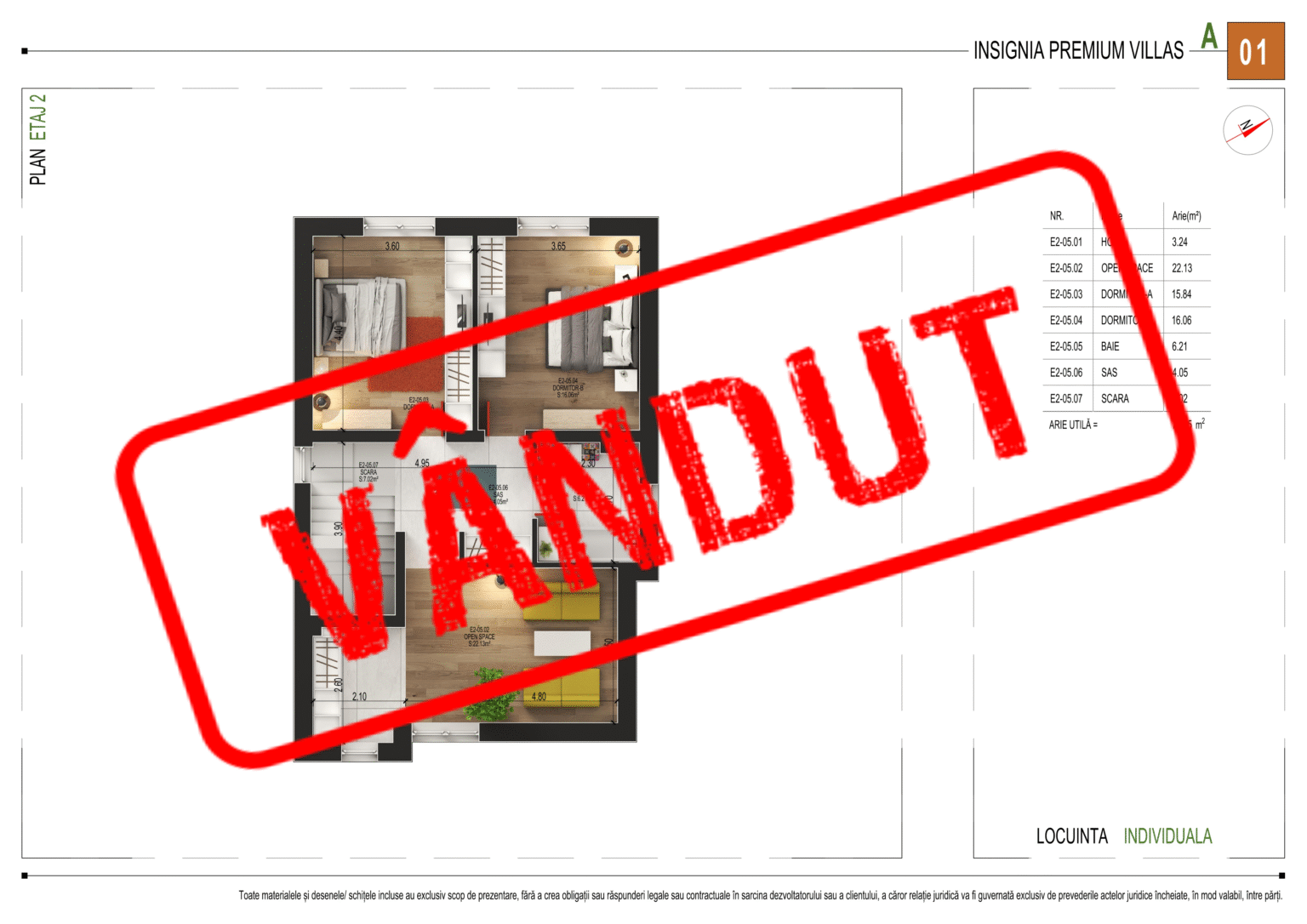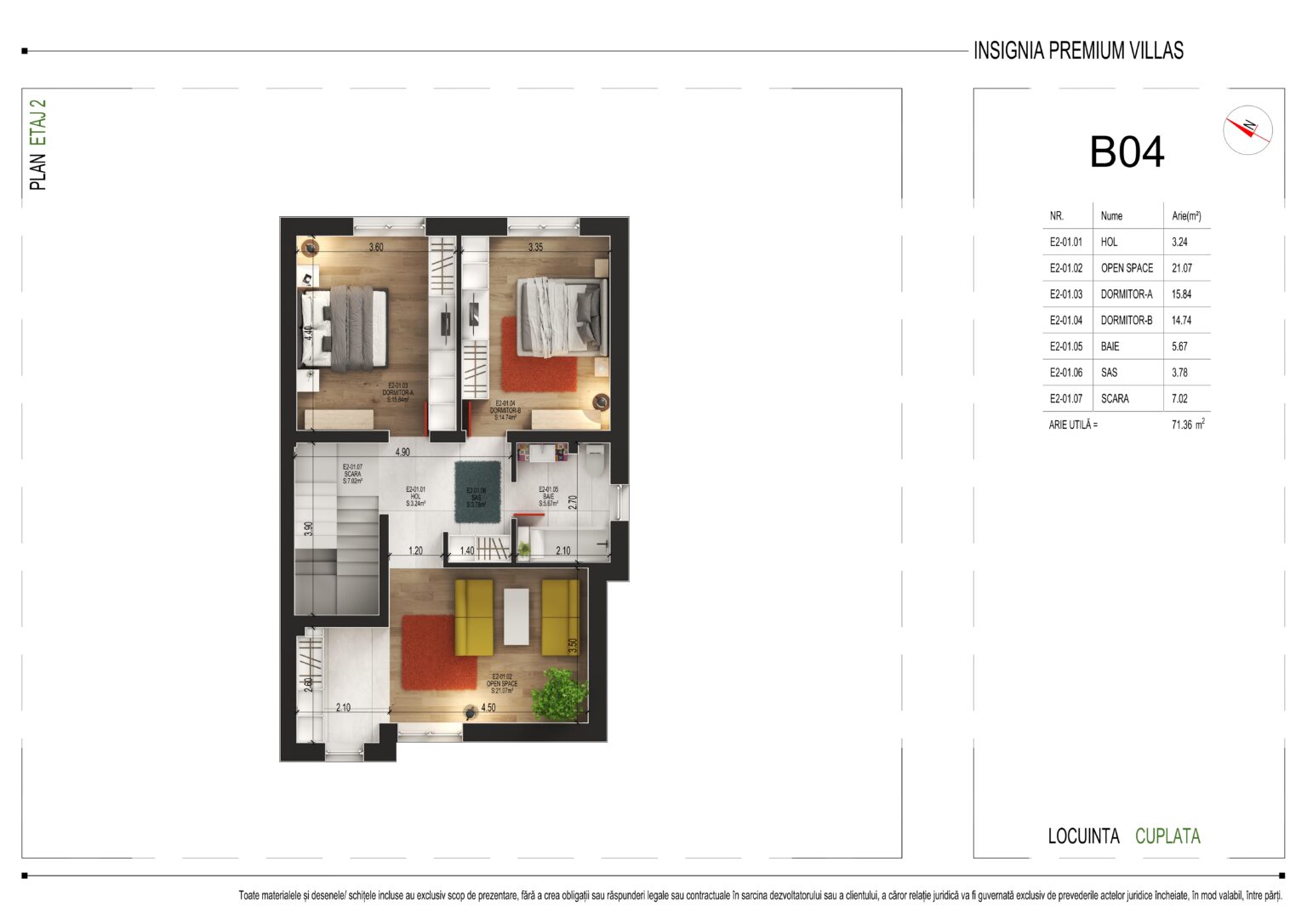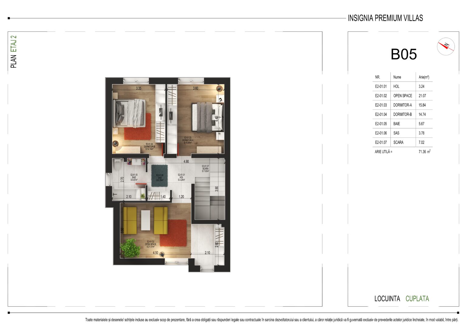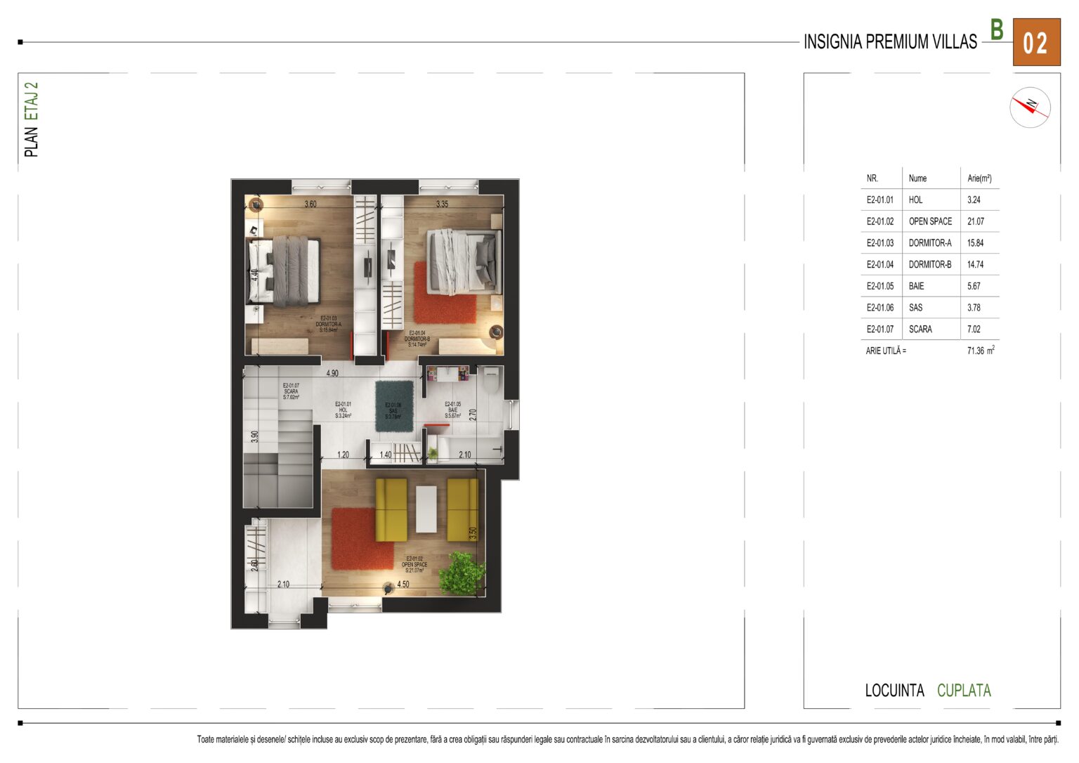 Cu o arie utilă totală de 71,36 m², etajul 2 oferă următoarea compartimentare: